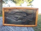 Large Primitive Vintage Hand Made Punched Tin Fish With Live Edge Wood Frame