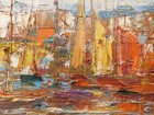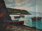 Antique Original Signed Oil On Canvas Painting Of Harbor/ Port, Sailboat Fishing