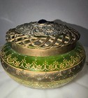 Antique Bohemian Green & Clear Glass Trinket Box Gold Enamel Gem Dresser Jar