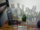 Lot Of 14 Antique Vintage Old Glass Medicine Bottles, Blue, Clear Embossed Mixed