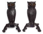 Antique Vintage Cast Iron Fireplace Pair Owl Andirons Glass Eyes 13" Glow Yellow