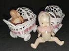 Adorable Vintage Miniature Bisque/celluloid Baby Dolls In White Wicker Strollers