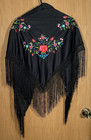 Fringed Shawl Wrap Black Floral Embroidered Mexican Folk Art Western Festival