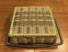 Vintage Sewing Basket Faux Ratan Wicker Sea Foam Green Satin Lining Japan 10.5”