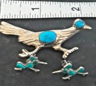 Southwest Native American Design Sterling Silver & Turquoise Roadrunner Brooch
