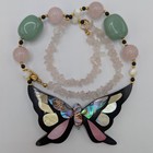 Lee Sands Abalone Mop Inlay Butterfly Rose Quartz Jade Bead Necklace 20" Vintage