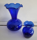 Pair Of Vintage Cobalt Blue Art Glass Flower Vases- Large Ruffle Rim & Small Bud