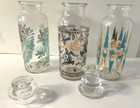 3 Vintage Apothecary Jar Mid Century Glass Atomic Gold Turquoise Birds Leaves