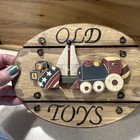 Vtg Country Wooden Sign Old Toys Train Boat Top Blocks 8 X 6 Oval