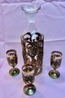 Vintage Decanter Set W/3 Matching Cordials Applied Silver Metal Grape Pattern