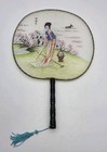 Hand Painted Silk Paddle Hand Fan Asian Woman Geisha Bamboo Handle Vtg