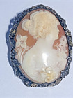 Antique Victorian Large Shell Cameo Silver - 14k Accent Brooch Pin- Pendant