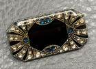 Vintage Art Deco Style Lacquered Brooch Pin Gold Black Silver Tone Rhinestones