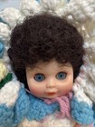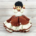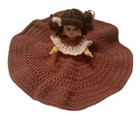 Vtg Crocheted Bed Pillow Doll 13” Brown/white Floral Dress Sleepy Eyes Brunette