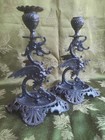 2x Vintage Black Cast Iron Candle Holder Gothic Dragon Griffin Gryphon Figures