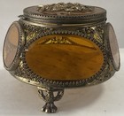 Vintage Ormolu Filigree Jewelry Casket/trinket Box With Amber Beveled Glass