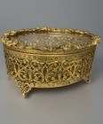 Vintage Ormolu Filigree Oval Jewelry Trinket Box/casket With Beveled Glass