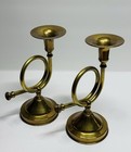 Vintage Polished Brass Taper Candle Holder Curved, 3 French Horns, Trumpets Euc