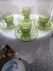 Charming Vtg Indiana Green Glass Thumbprint Coffee Tea Cups W Saucers Set Of 4