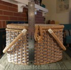 Unique Vintage Woven Sewing Basket With Wooden Lid.
