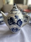 Vintage Gzhel Hand Painted Porcelain Teapot Blue Floral Pattern Gold Plated