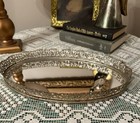 Vintage Vanity Tray Mirror Oval 14” Metal Filigree Edge Hollywood Regency