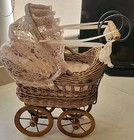 Vintage Large Baby Doll Carriage Buggy Lace Canopy Fabric Liner Wicker Metal