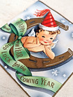 Vintage 1950's Unused Happy New Year Cherub Lucky Hoof Greeting Card (eb8154)