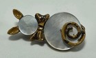 Vintage Metal Mop/abalone Cat W/bow Brooch Lapel Hat Pin ~1.5" Brown Enamel