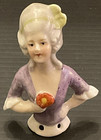 Vintage German Porcelain Pin Cushion Doll Purple Hat Half Doll Approx 2.25"h