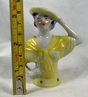 Vintage Porcelain Half Doll Pin Cushion Doll Yellow Hat Beauty With Black Hair