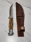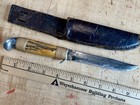 Vtg 1950’s Queen Cutlery Fixed Blade Hunting Knife Bone Leather Sheath 3.5” Blad