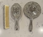 3-piece Ornate Vintage Vanity Hair Brush, Comb, & Mirror Set Silver Plate Heavy