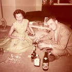 1950s Stylish Couple On Floor Drinking 7up Midcentury Vintage Snapshot Photo