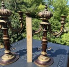 Vtg Heavy 15 1/2" Bronze Candelabra Candle Holder Pair W/ Turret Finial Crowns