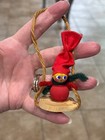 Vtg Wood Elf Gnome Pixie Ornament Holding Gift Felt Hat 3.5" Unique Design