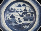 Chinese Export 19thc Canton Blue Village Porcelain Octagonal Warming Dish Plate