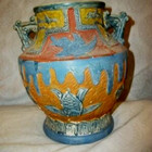 Antique Tokanabe Japanese Carved Pottery Vase Koi Fish Elephants Bold Color