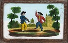 Antique 19th C. French Reverse Painted Trinket Mirror Men Dancing Oak Frame