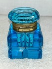 French Antique Art Deco 1850 Azure Blue Cut Glass Ink Well 2.5”x1.5”x1.5” Vgc