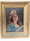 Antique 19th Century Oil Painting On Board Portrait Of Young Lady, Wood Frame
