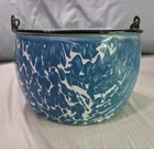 Antique Blue & White Swirl Graniteware Berlin Kettle Bucket W/ Wood Bail Handle