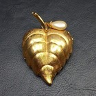 Empty Avon Gold Tone Faux Pearl Leaf Solid Perfume Locket Compact Brooch Kj