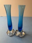 2 Vintage Art Glass Bud Vase Clover Foot Blue 6.5”