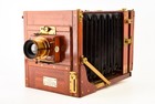 Vintage 5x7 Camera Made Of Leather, Polished Wood, Brass Lens & Maroon Bellows