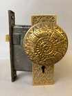Victorian Ornate Brass Door Knob Set With Plates And Lock No Key Geometric Pat.