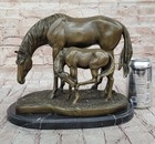 Bronze Home Decor Statue Marble Base Wildlife Art Horses Mare Foal Pair Riding