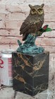 Bronze Owl Sculpture On Tree Branch With Green Patina On Black Marble Base