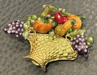 Vintage Enamel Fruit Basket Grapes Pumpkin Apples Gold Tone Brooch Pin