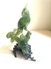 Exquisite Highly Carved Green Stone 6” Figural Flower Bird Sculpture, Wood Stand
